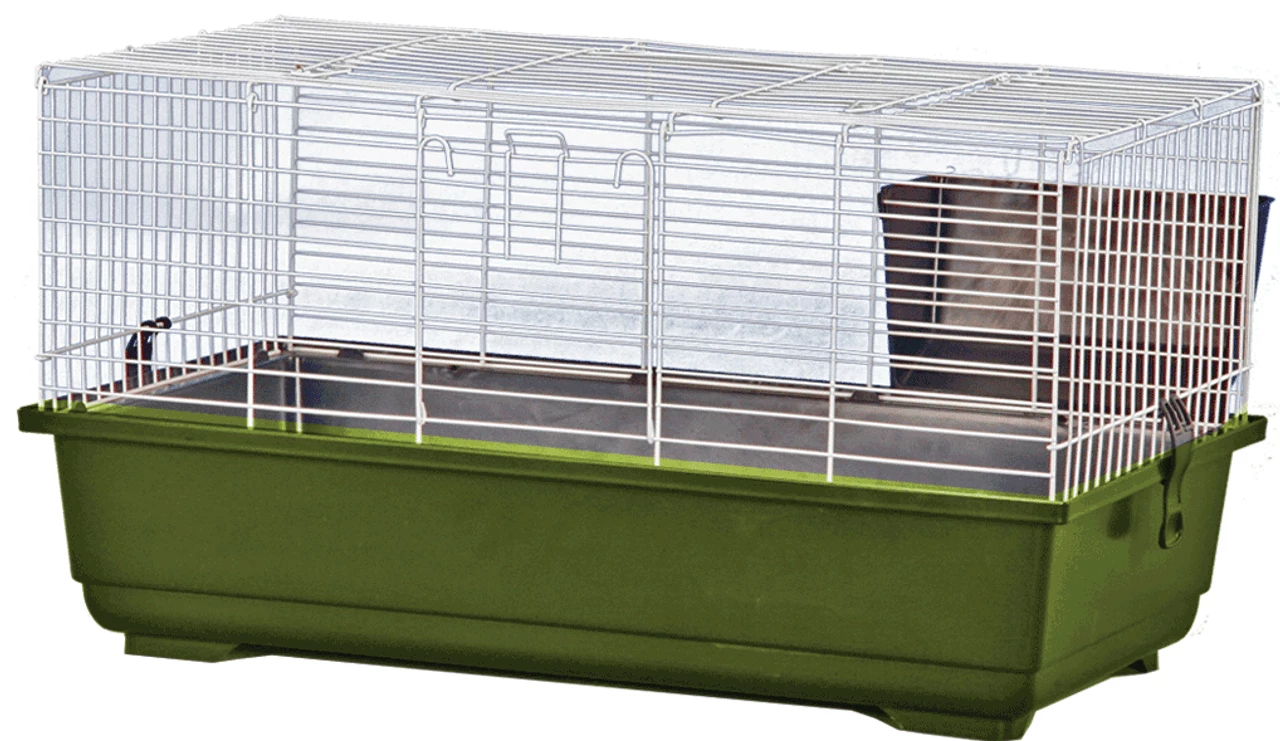 Suitable not only for rabbits, but other small animals. Made with a solid and durable plastic base and strong wire that is escape proof. Has a removable hay holder included. Plenty of space inside to add toys and/or treats.