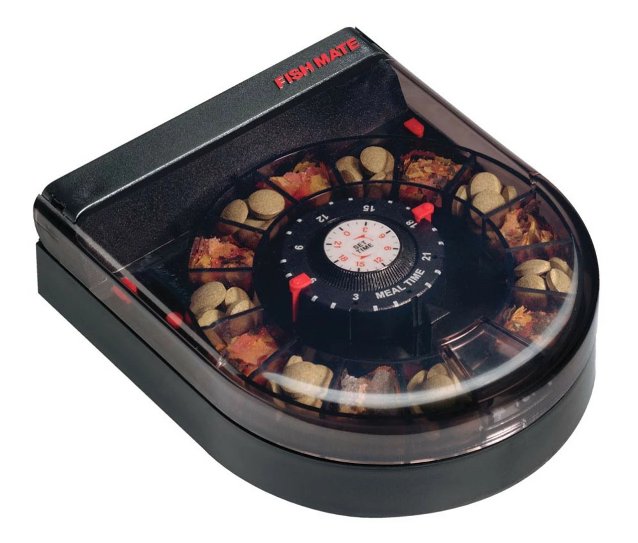 The Fish Mate F14 Aquarium Fish Feeder is a high quality automatic aquarium food dispenser. Individual compartments allow a varied diet suitable for all popular flake or pellet foods. The battery operated timer serves up to four meals a day, with a capacity for up to 14 meals total. Provide your fish with accurate feeding of all dry and flake fish foods. Serves up to 14 meals; Accurate feeding of all dry fish food & flake foods; Easy to use timer provides 1-4 meals a day.