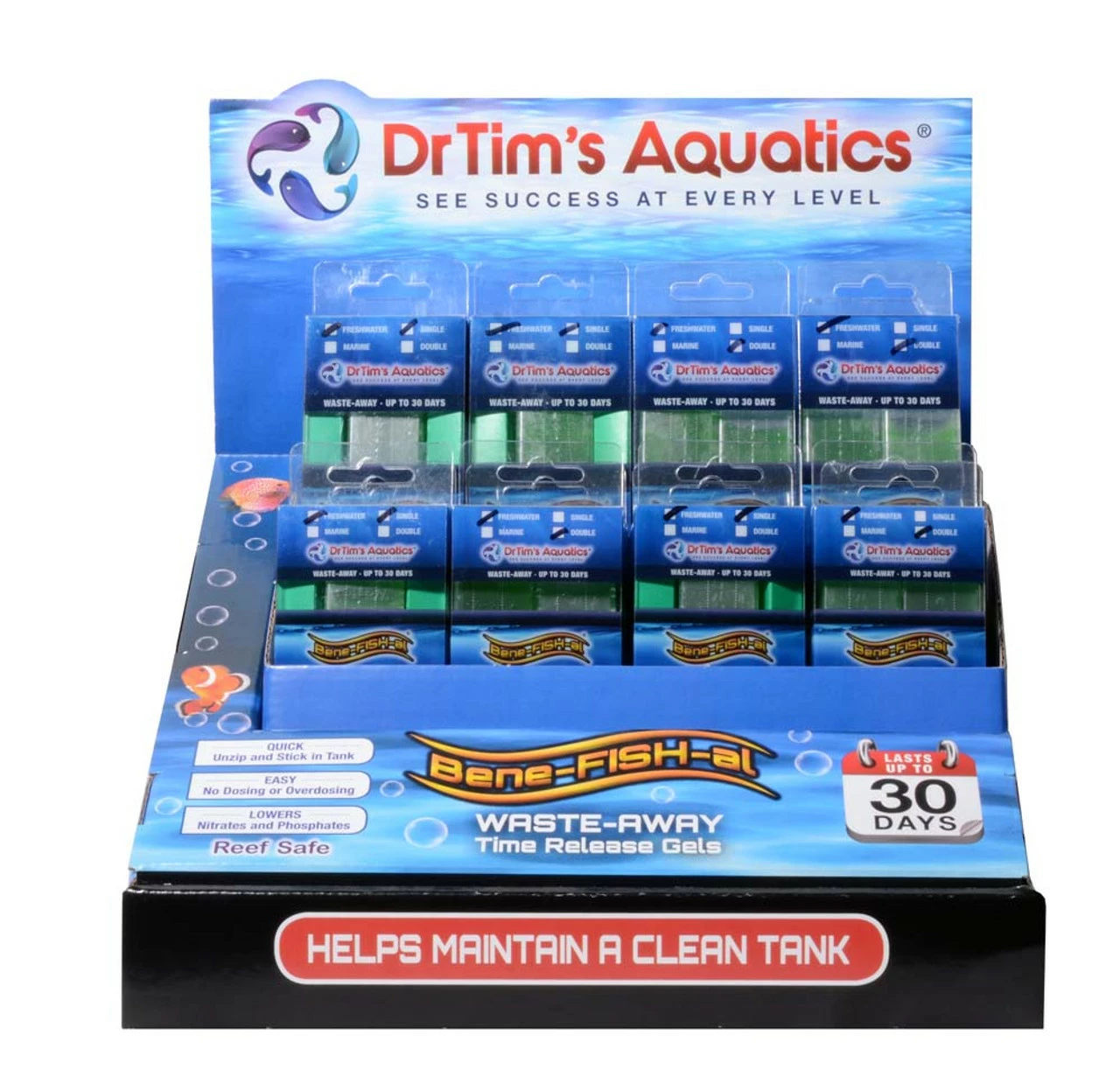 A convenient, colorful counter display of 12 assorted Freshwater Waste-Away Time Release Gels containing 2 of each size/type (single or 2-pack) for a total of 12 pieces. Refillable from open stock. DrTim’s Aquatics Waste-Away Time Release Gels continuously release good bacteria into the aquarium water. These good bacteria consume nitrate, phosphate and organics keeping the tank cleaner and the water clearer. No need for dosing pumps, tubing or connection such unzip the shrink wrap, adhere the provided suction cup and stick the gel in your tank, sump or filter box. The gels last up to 30 days and will change color to indicate they need to be replaced.