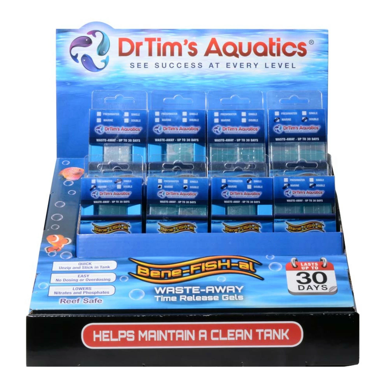 A convenient, colorful counter display of 12 assorted Marine Waste-Away Time Release Gels containing 2 of each size/type (single or 2-pack) for a total of 12 pieces. Refillable from open stock. DrTim’s Aquatics Waste-Away Time Release Gels continuously release good bacteria into the aquarium water. These good bacteria consume nitrate, phosphate and organics keeping the tank cleaner and the water clearer. No need for dosing pumps, tubing or connection such unzip the shrink wrap, adhere the provided suction cup and stick the gel in your tank, sump or filter box. The gels last up to 30 days and will change color to indicate they need to be replaced.