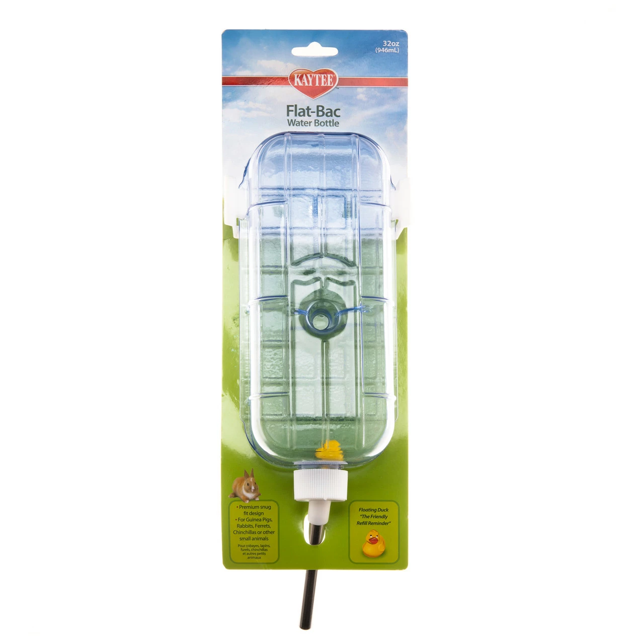Flat-Bac 32oz Water Bottle is a premium quality bottle with a smooth flat surface that fits tightly against your pets cage. Snap Lock Bottle Bracket easily attaches to the cage and the contoured bottle snaps into a secure position. Made of durable clear plastic with a floating duck inserted as a friendly refill reminder. Stainless steel spring loaded dripless sipper. Snap-lock Bottle Bracket with the convenient E-Z twist attachment knob allow for effortless bottle removal and refilling. Easily adapts for use either inside or on the outside of the cage. Extra large 32oz size is ideal for the Rabbits ferrets Chinchillas and guinea pigs.