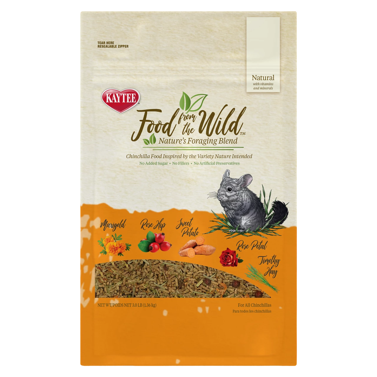 In the Wild, chinchilla forage a complex range of nutrients from a variety of grasses, barks, and flowers to support optimal health. As herbivores, chinchillas require a diet high in fiber to provide essential nutrients, maintain proper bacteria levels in the gut, and promote digestive health. The animal nutrition experts at Kaytee developed Food From the Wild blend for the forager in your family. Inspired by the ancestral feeding habits of chinchilla, Food From the Wild blend is crafted with hand-selected rose hip, marigold, sweet potato, and timothy hay to encourage the healthy foraging activity your chinchilla needs.
