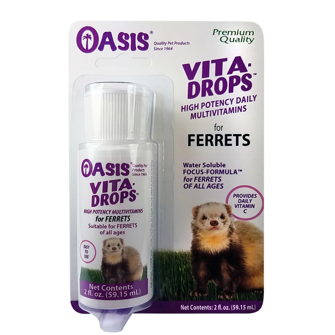 Oasis Vita-Drops for Ferrets are formulated to meet the nutritional needs of today s ferrets. This formula contains all essential recommended vitamins for pet and show ferrets of all ages. Vita-Drops coordinate with packaged diets and help assure complete nitritional intake if and when feed products age. Vita-Drops are the most convenient way to assure ferrets are receiving their daily intake of vitamins essential for normal growth & development. Just two drops per ounce of drinking water makes Vita-Drops the best supplement value available on today’s market. 2 fluid ounce bottle with dropper cap.